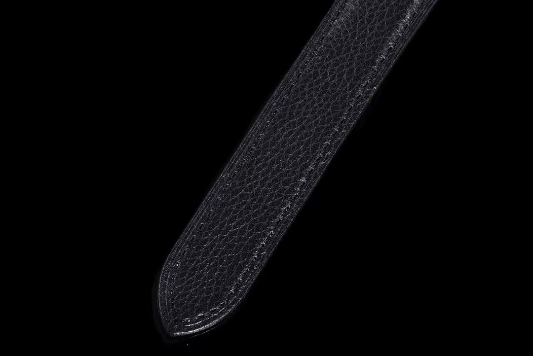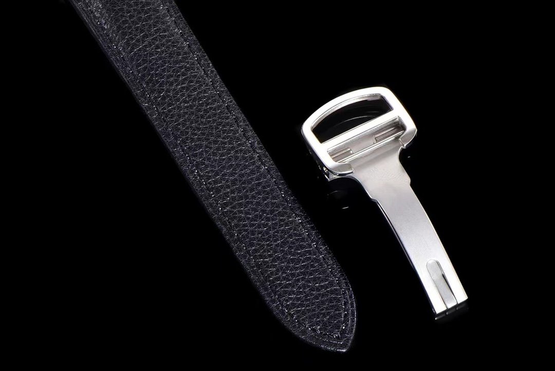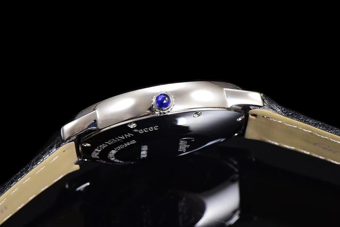 Diameter: 36mm gold size, round case with Cartier’s highly recognizable Roman scale, burned steel blue sword shaped hands, crown inlaid with blue spinel genuine material.