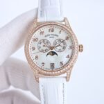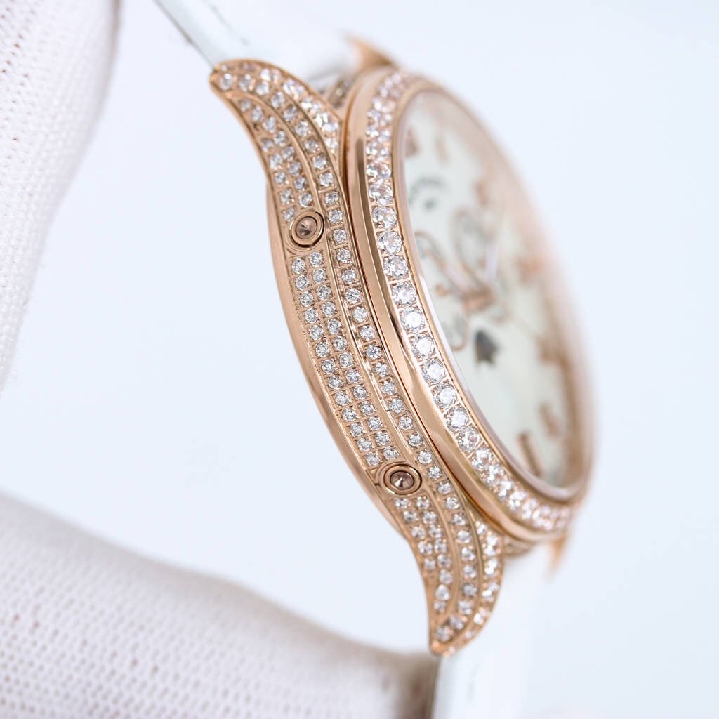 The ladies’ calendar moon phase watch combines practical calendars with elegant moon phases, and is embellished with a diamond studded case, blending the luxurious radiance of the wrist with outstanding performance. It is classic and fashionable, and beautiful beyond measure.