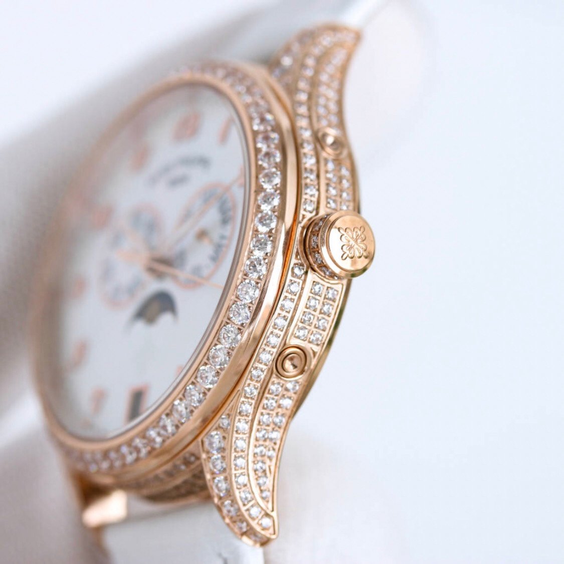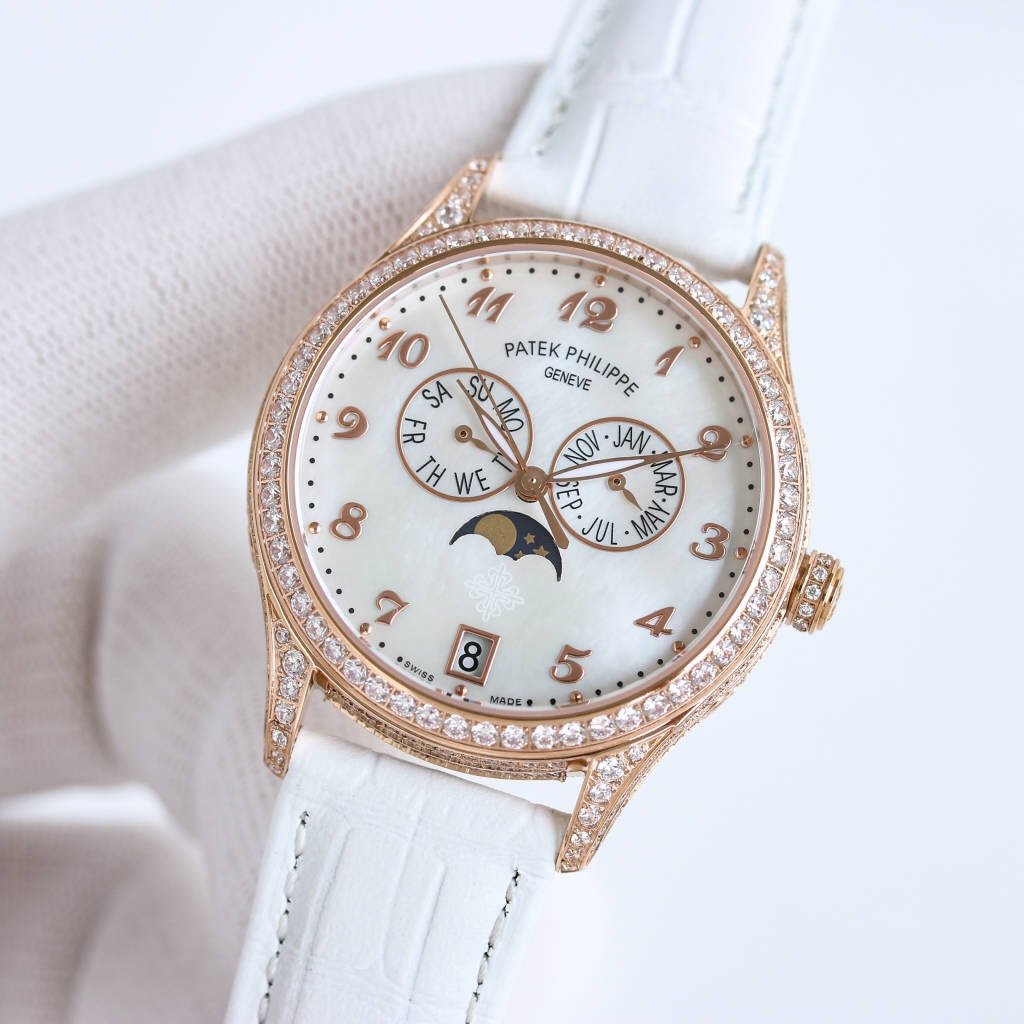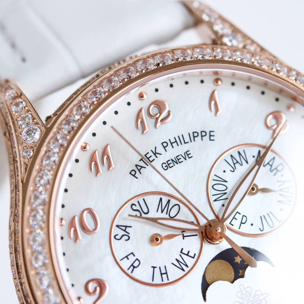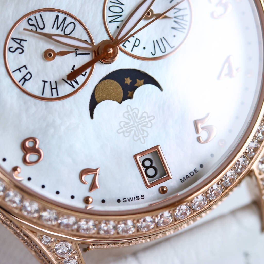 It is engraved with the classic Patek Philippe “Calatrava Cross Star” logo, showcasing the beauty of brand recognition. On the side of the crown, there is a decorative ring of diamonds, which is identical to the style of the case and enhances the overall sense.