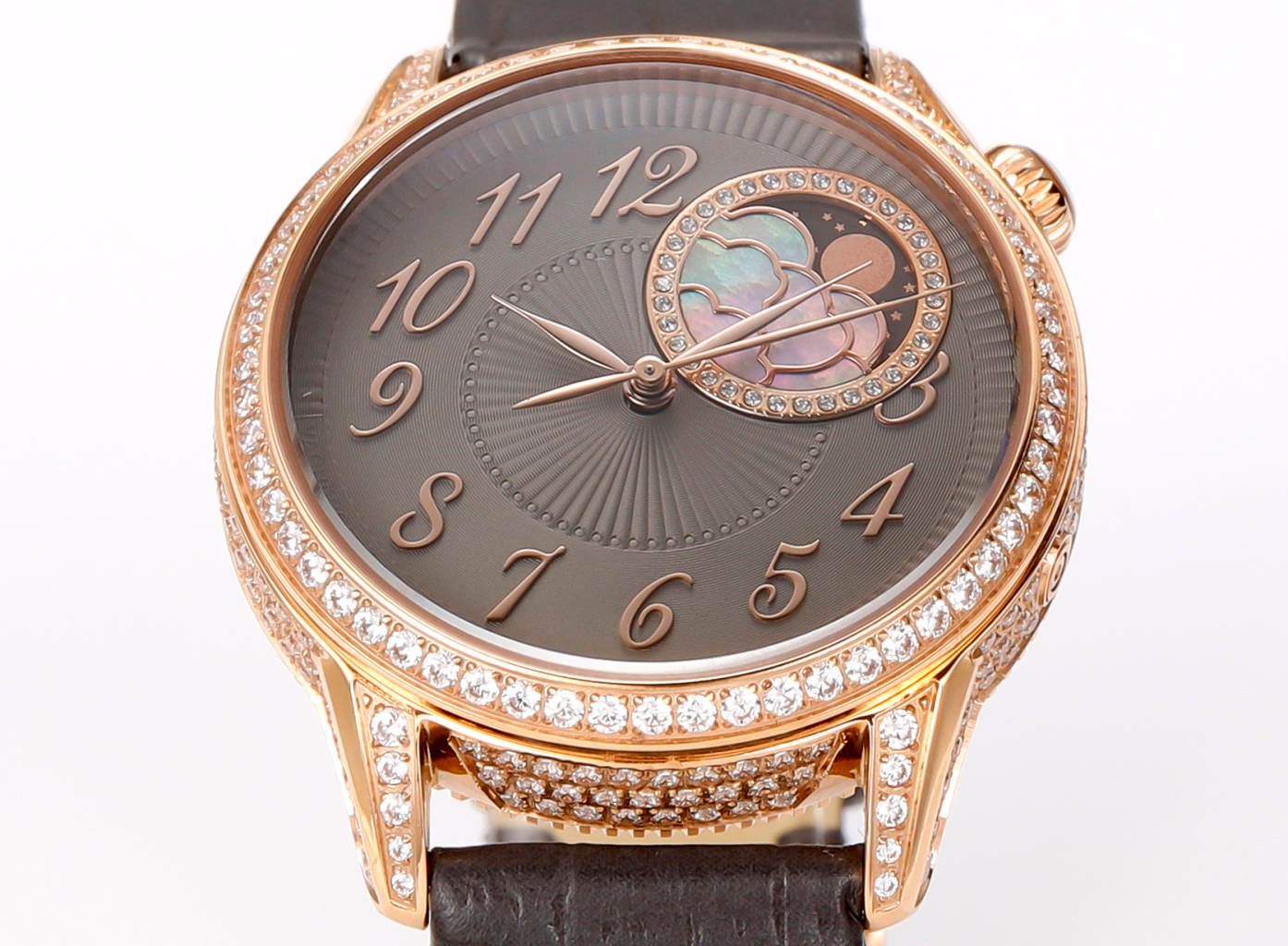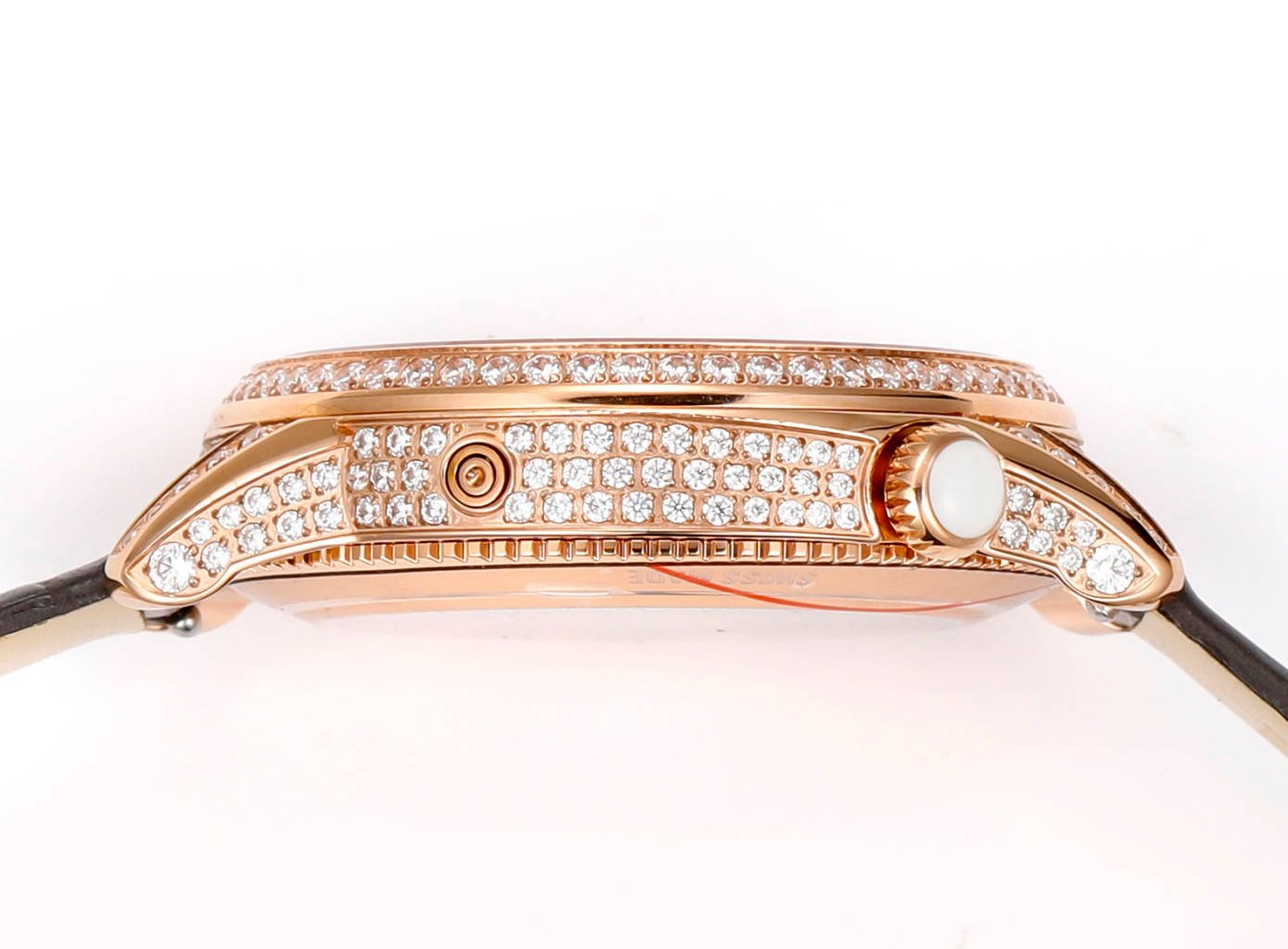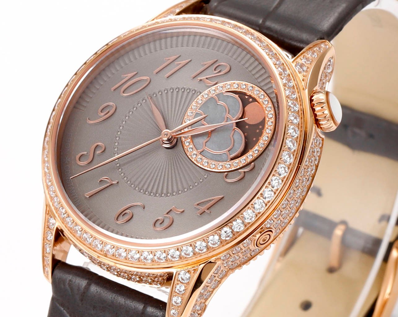 The crown of the watch is adorned with a curved cut moonstone symbolizing calmness and tranquility. The flat round shape is opposite to the official version, and the eccentric circular dial with sparkling diamonds displays time in a dreamy way.