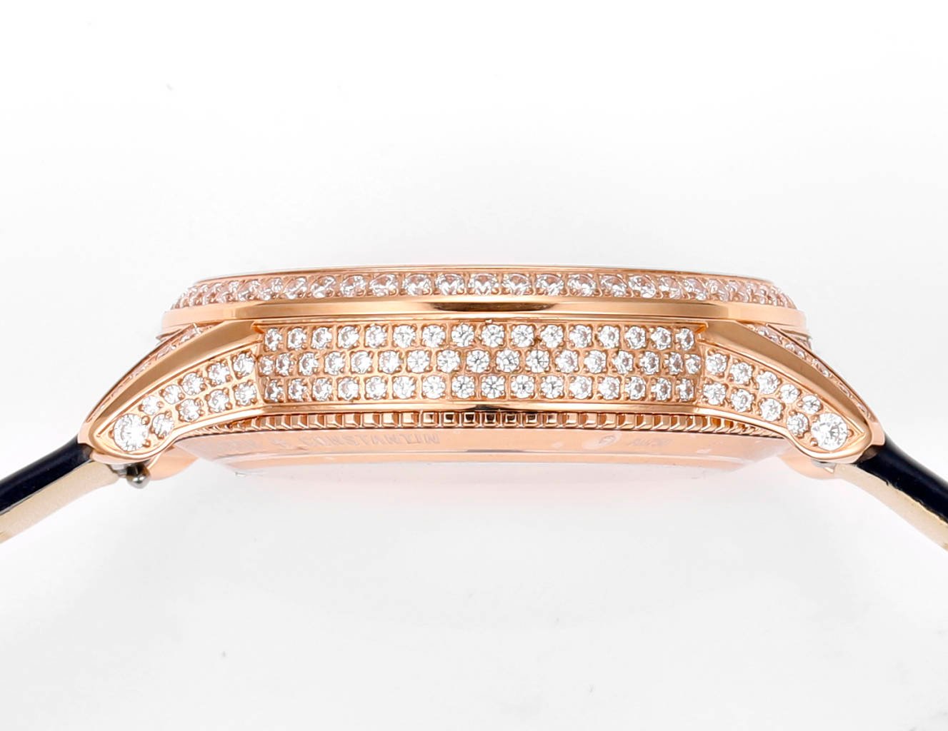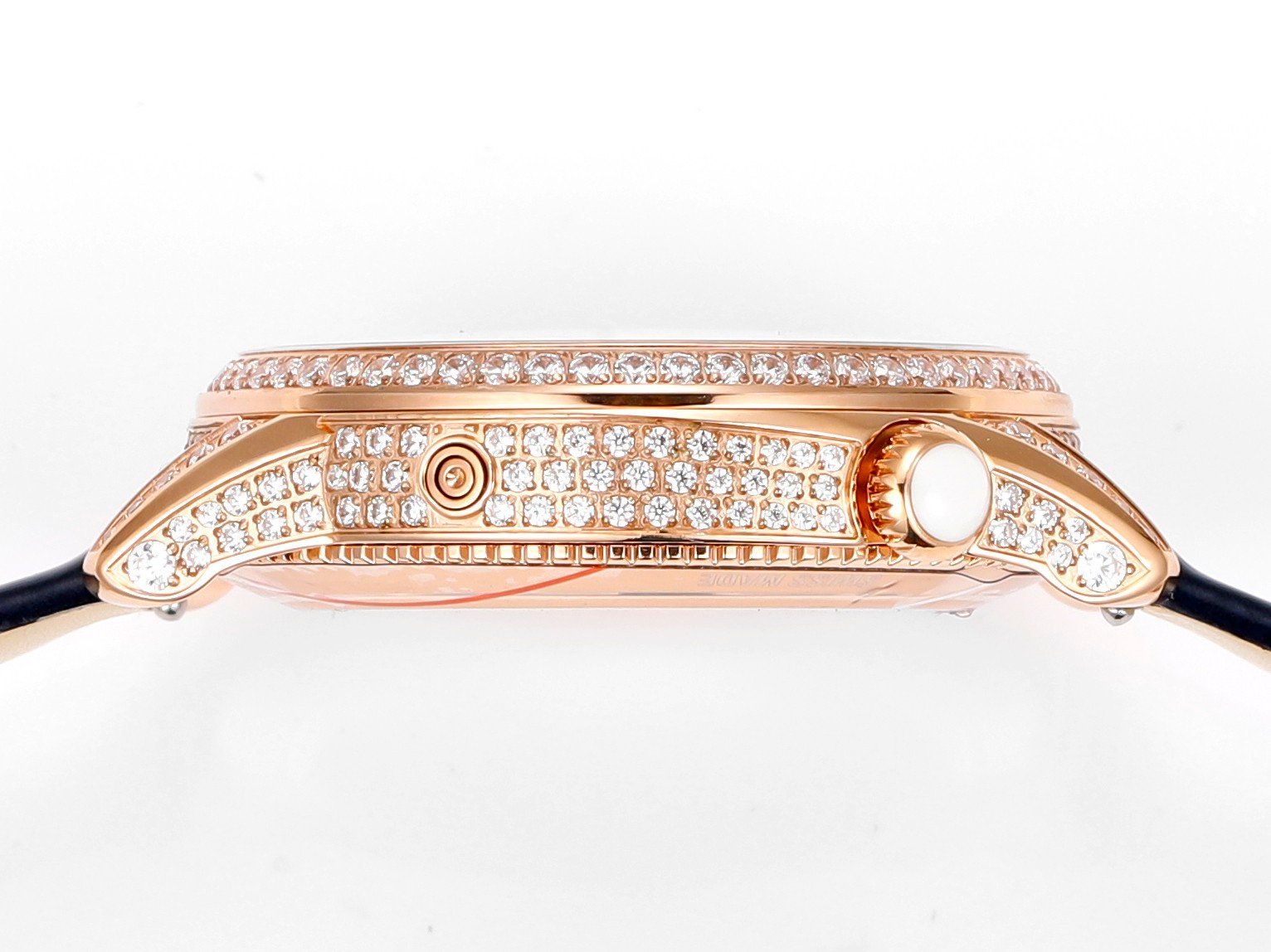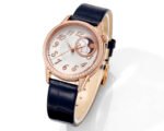 The crown of the watch is adorned with a curved cut moonstone symbolizing calmness and tranquility. The flat round shape is opposite to the official version, and the eccentric circular dial with sparkling diamonds displays time in a dreamy way.