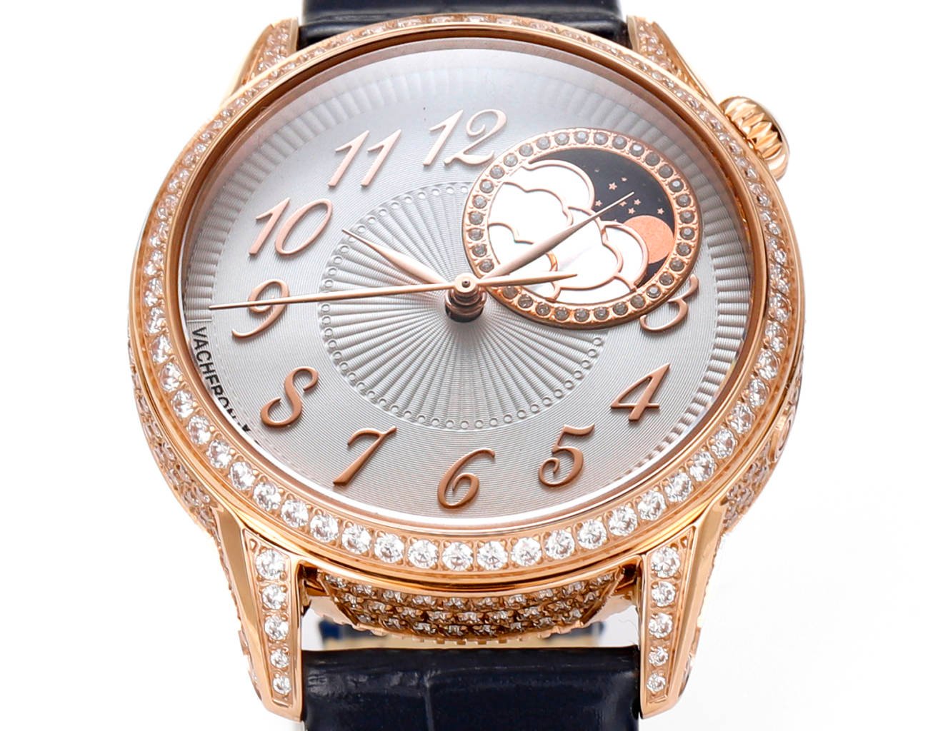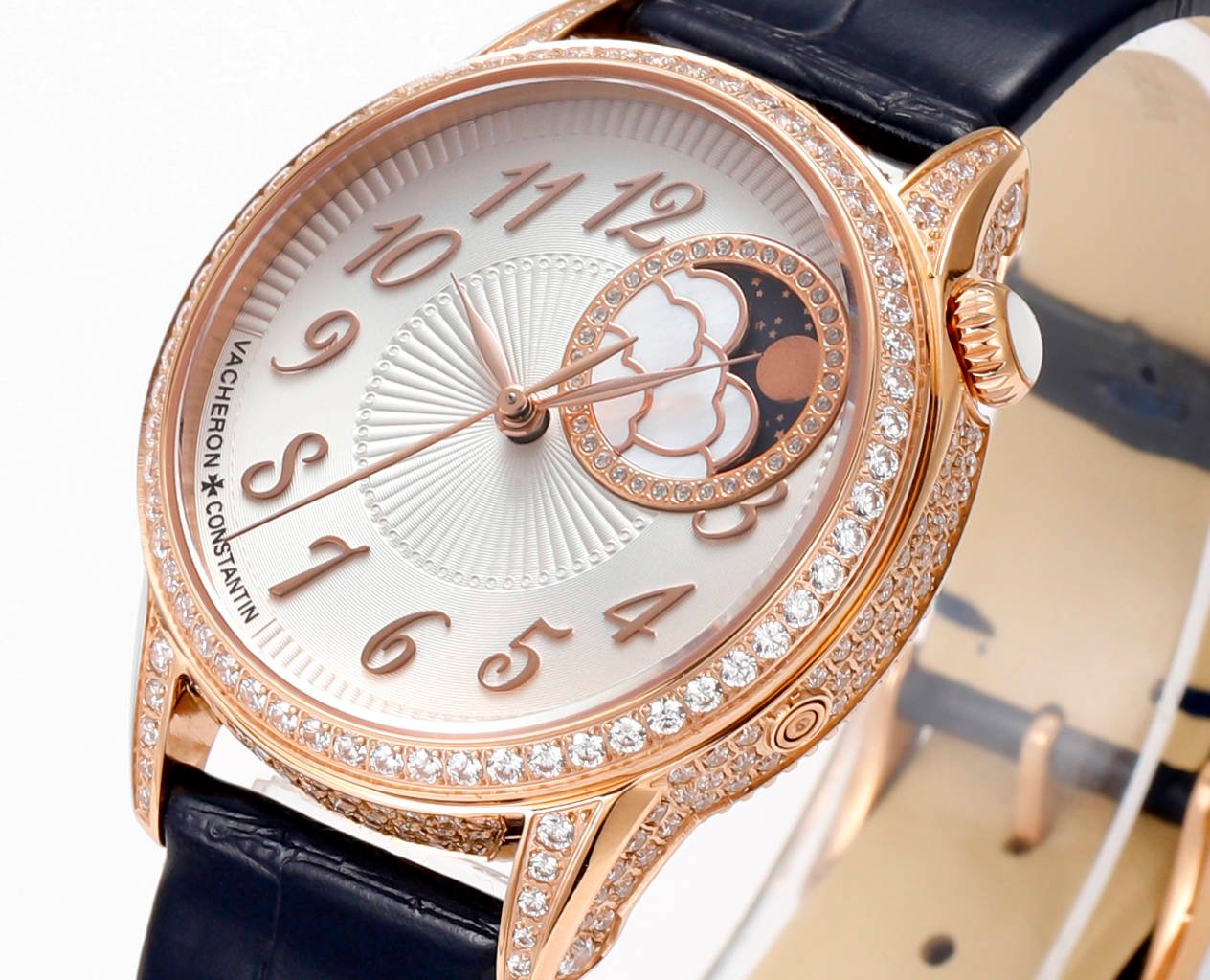 Moon phase version (8005F/000R), exquisite mother of pearl is carved into white clouds.